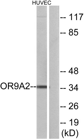 The antiserum was produced against synthesized peptide derived from human OR9A2. AA range:260-309