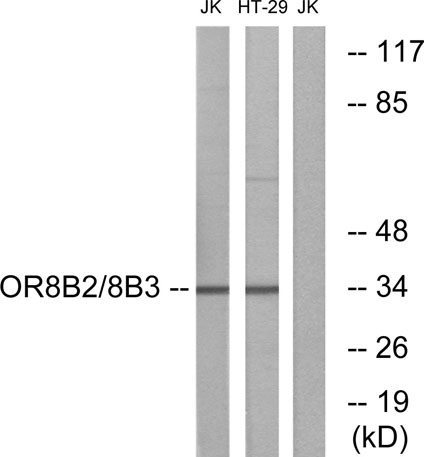 The antiserum was produced against synthesized peptide derived from human OR8B2/8B3. AA range:199-248