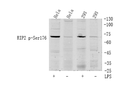 The antiserum was produced against synthesized peptide derived from human RIPK2 around the phosphorylation site of Ser176. AA range:146-195