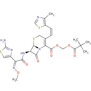 Smiles CC1=C(SC=N1)/C=C\C2=C(N3[C@@H]([C@@H](C3=O)NC(=O)/C(=N/OC)/C4=CSC(=N4)N)SC2)C(=O)OCOC(=O)C(C)(C)C