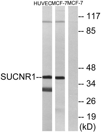 The antiserum was produced against synthesized peptide derived from human SUCNR1. AA range:100-149