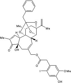 Smiles C[C@@H]1C[C@]2([C@H]3C4[C@]1([C@@H]5C=C(C(=O)[C@]5(CC(=C4)COC(=O)CC6=CC(=C(C=C6I)O)OC)O)C)O[C@](O3)(O2)CC7=CC=CC=C7)C(=C)C