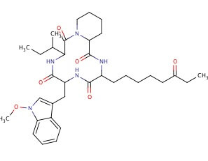 Smiles CCC(C)C1C(=O)N2CCCCC2C(=O)NC(C(=O)NC(C(=O)N1)CC3=CN(C4=CC=CC=C43)OC)CCCCCC(=O)CC